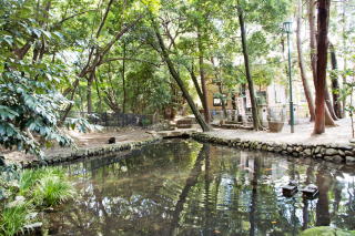 南方向にまっすぐ参道が伸び、東南の一角に清水(弁財天池と中島)がある。